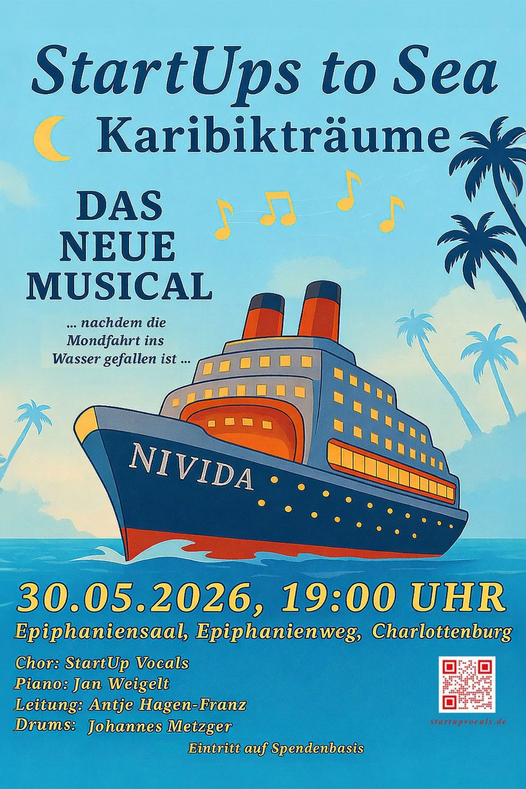 “Nachdem der Flug auf den Mond kurz vor dem Start geplatzt war, begeben sich die StartUp Vocals nun auf eine Kreuzfahrt in die Karibik. Die Vorfreude ist groß! Doch an Bord des Schiffes NIVIDA kommt alles anders als erwartert… Lassen Sie sich überraschen! Tauchen Sie mit uns ein in das komisch-Verrückte Abenteuer des StartUp Vocals auf hoher See!”